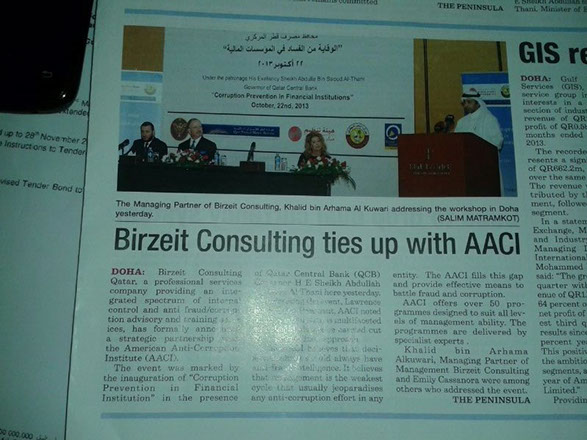 DOHA: October 22, 2013 Birzeit Consulting Qatar, a professional services company providing an integrated spectrum of internal control and anti fraud/corruption advisory and training services, has formally announced a strategic partnership with The American Anti-Corruption Institute (AACI).